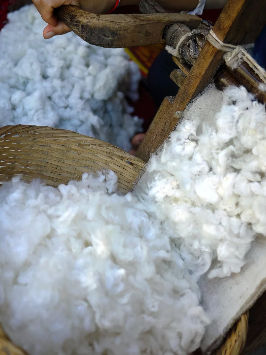 The Cotton fibers are spun into yarns using a spinning wheel or machine.
