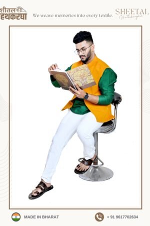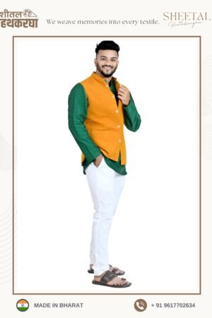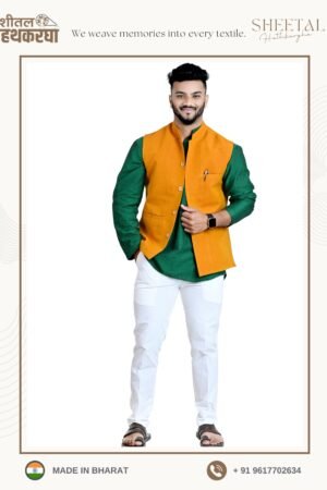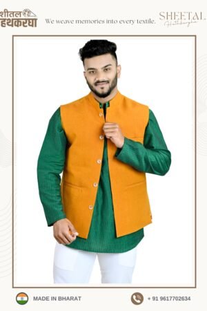 Be the first to review “Sheetal Hathkargha Men Handwoven Orange Color Pure Cotton Modi Jacket” Cancel reply