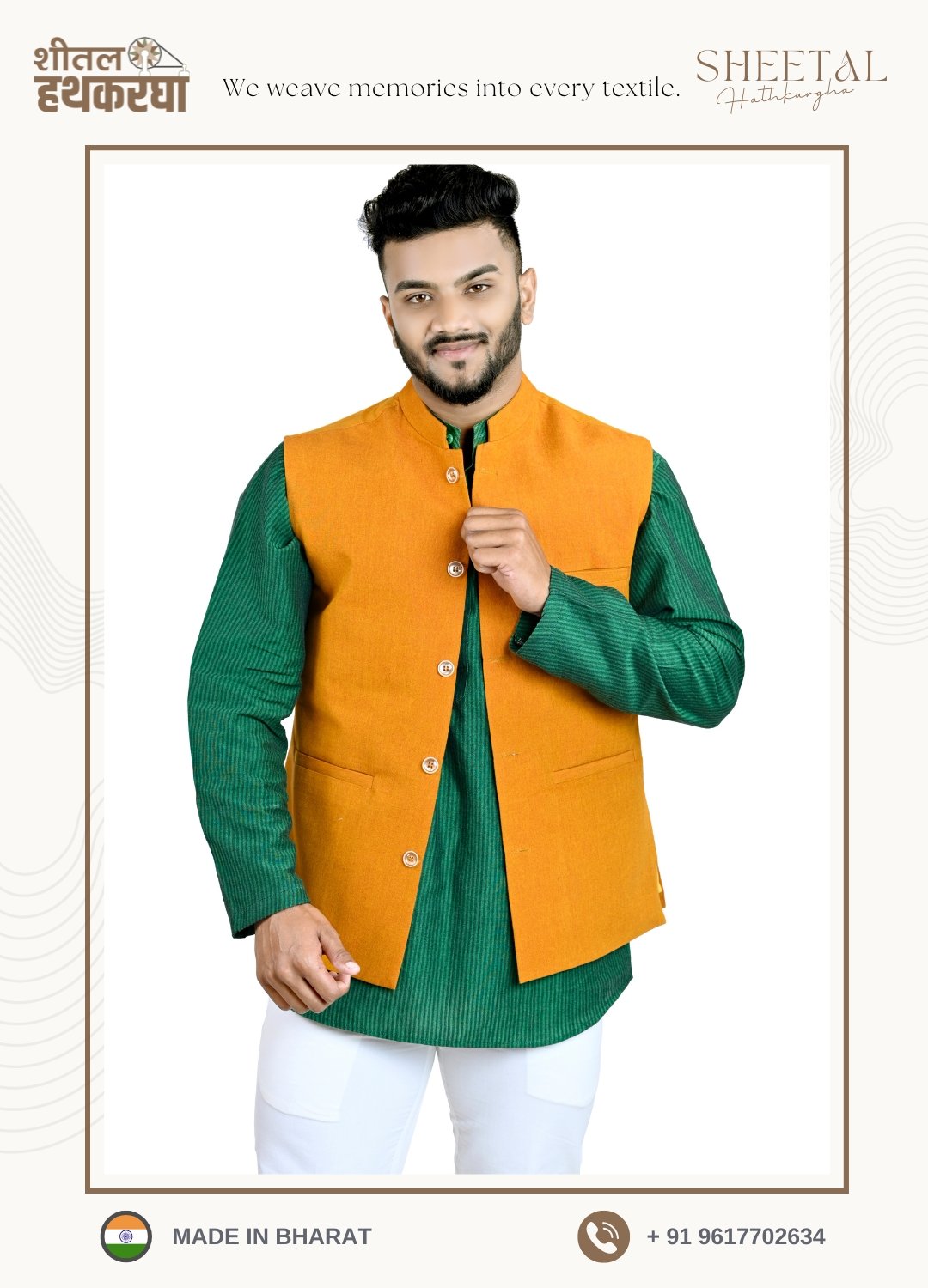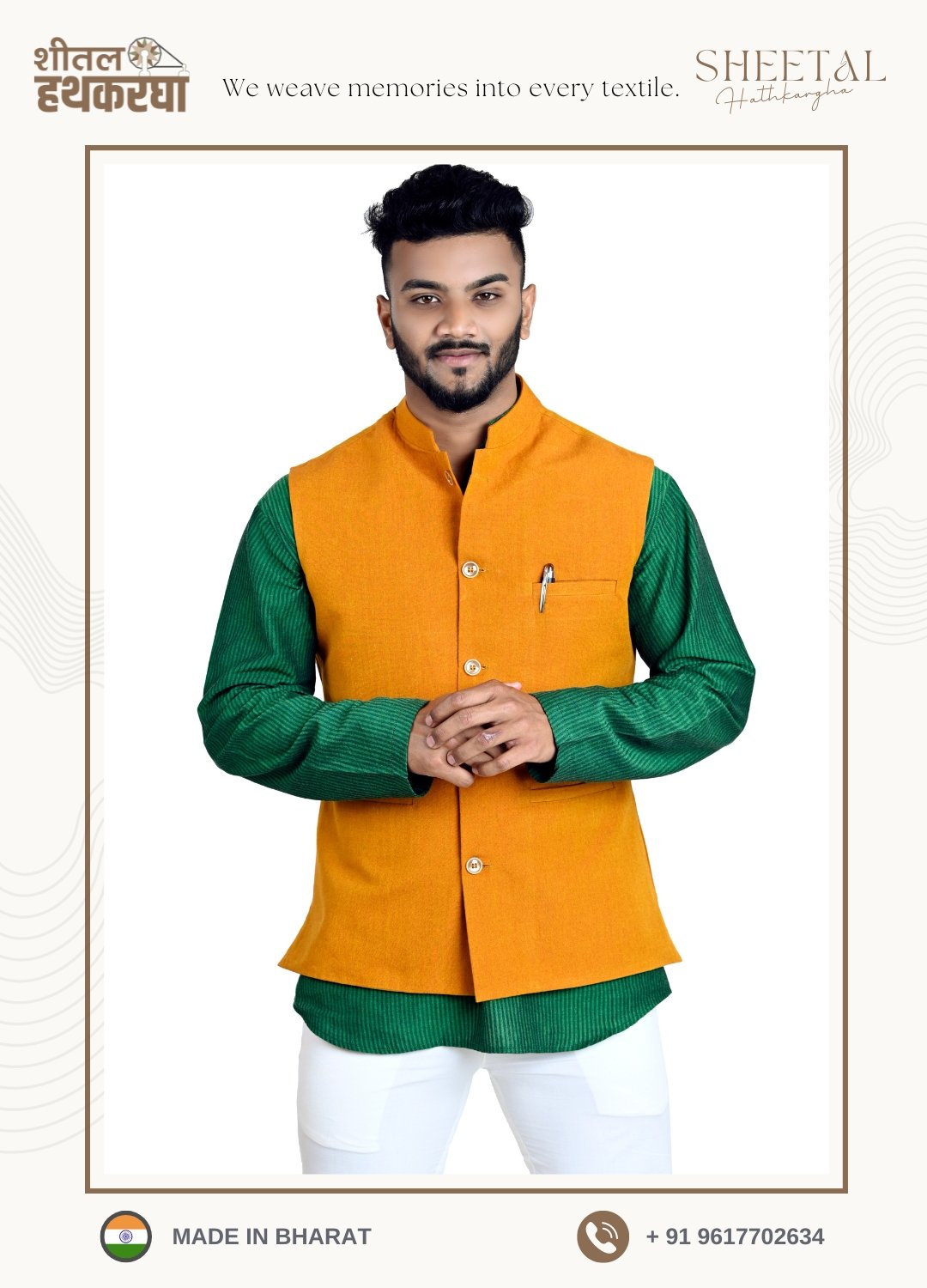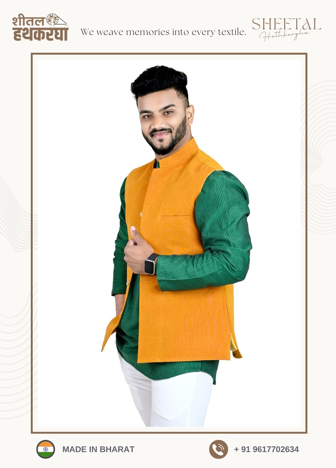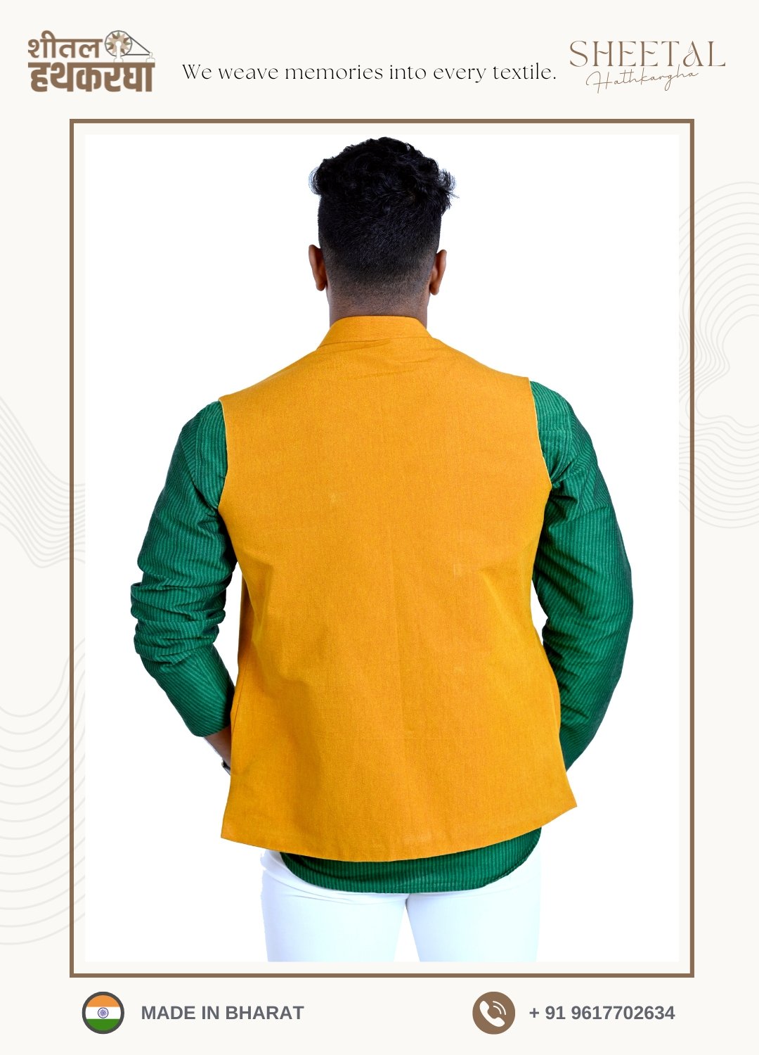 Sheetal Hathkargha Men Handwoven Tickseed Yellow Color Pure Cotton Modi Jacket